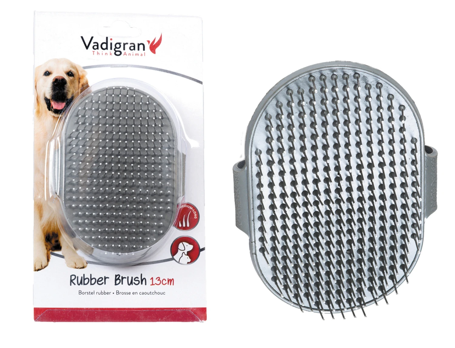 | Kenmerk | Massage – verzorging van dekhaar en ondervacht – zachte metalen pinnen – bevordert de bloedsomloop – verwijdert overtollige haren en stof – natuurrubber – om vacht losser te maken en te ontklitten – om te ontvilten en uit te dunnen |