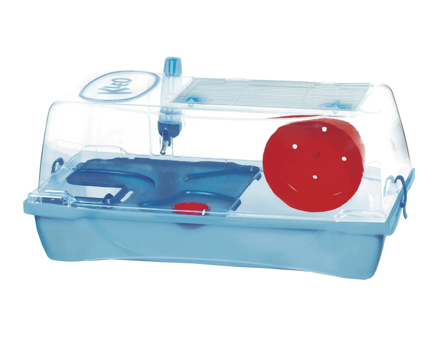 Comfortabele plastic kooi, volledig uitgerust voor kleine knaagdieren zoals muizen of hamsters.