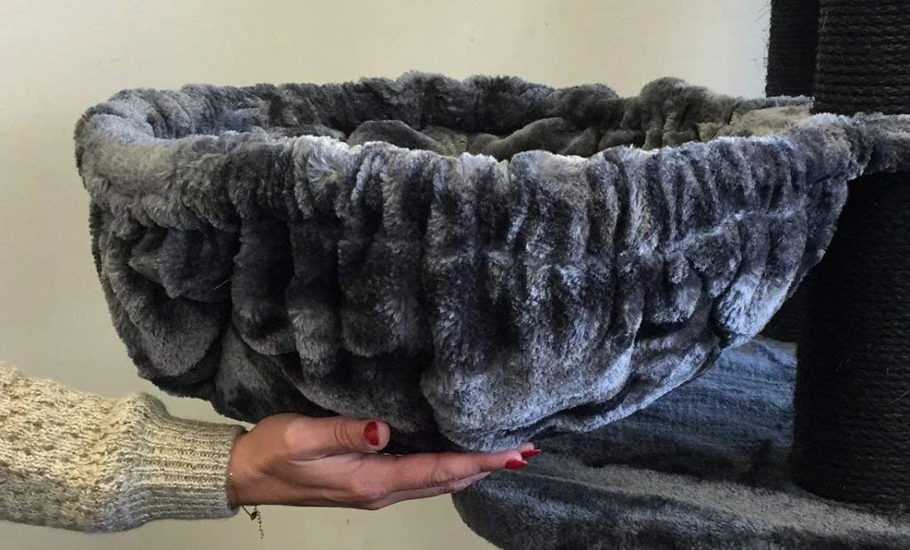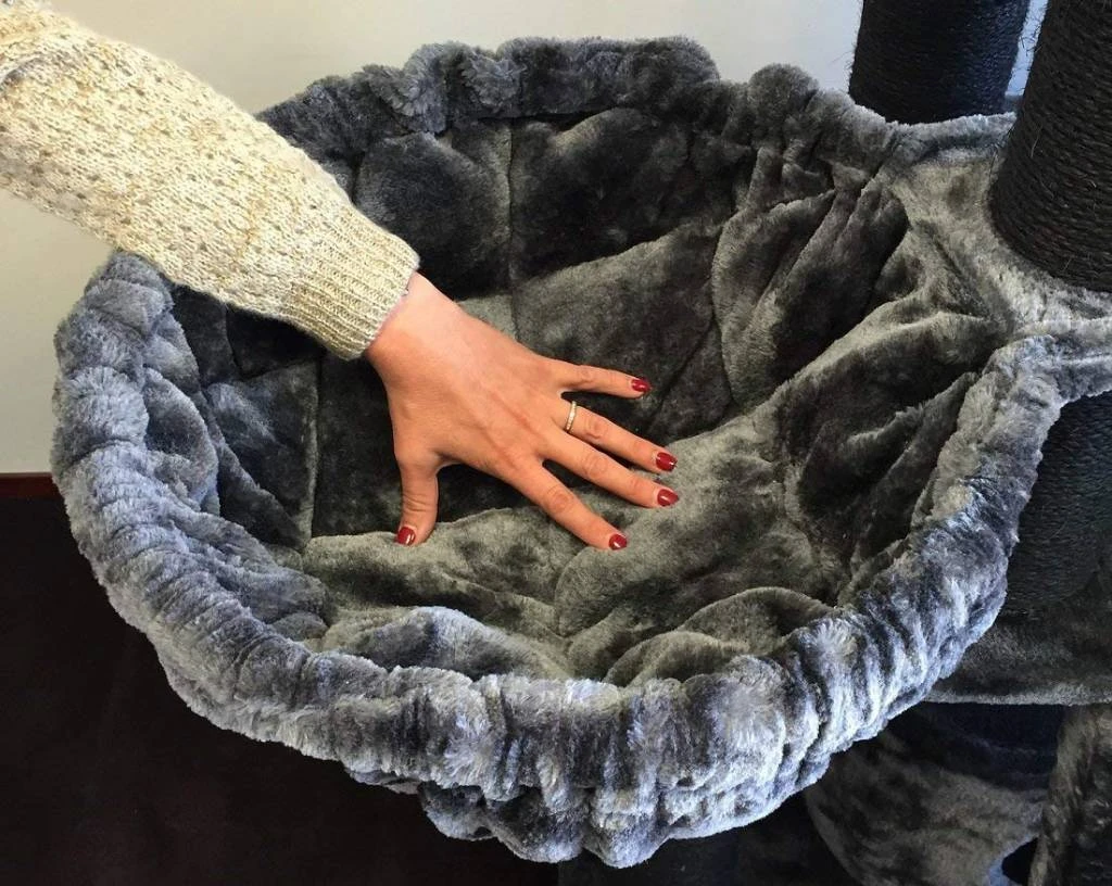 RHRQuality Hangmat de Luxe Antraciet voor uw krabpaal is 45 cmØ en getest op een draaggewicht van 20KG. Het nieuwe model 2018 is een combinatie tussen een kussen en een hangmat.