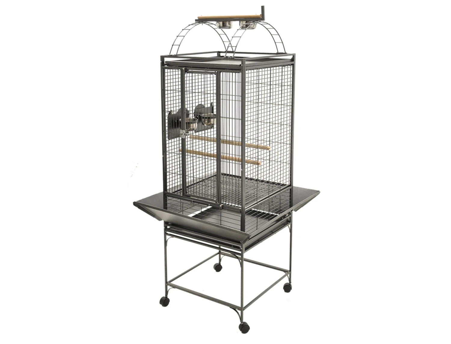 Kooi met zitstokken en 2 roestvrij staal kommen.Ruime en sterke kooi op wielen voor gemakkelijke beweging.De randen beschermen de bodem van spatten en vuilnis.Makkelijke montage.