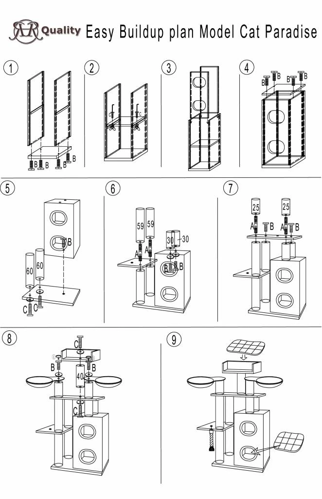 Deze krabpaal biedt ruim voldoende krabmogelijkheden om uitgestrekt te krabben aan de sisalpalen of het met sisalkleed bekleedde speelhuis. Het speelhuis heeft de afmetingen 50 x 60 x 91 cm en heeft 2 grote (25 x 20 cm) in- en uitgangen aan de voorzijde.