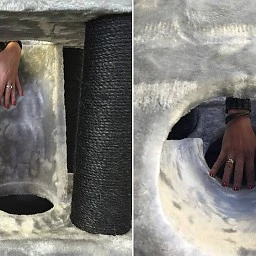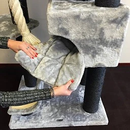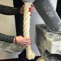 Met een grote dikke bodemplaat en onderin een gecurvde trap bekleed met sisalkleed om aan te krabben. Het verstophuis (53x38x31cm) heeft een grote ingang en via de bovenkant kan uw kat via een half ronde pijp naar de volgende verdieping komen. Ook eventueel eenvoudig via de opstap aan de linkerzijde. Ook hangt er een leuk 5cm dik speeltouw aan de krabpaal. Op de 2e verdieping is tevens een grote ligplek. Geheel bovenin zijn nog eens 2 hoge directiezetels. Waarvan een grote directiezetel van 60×43 cm met 5 cm dik kussen en 1 hangmat de Luxe ( Draaibaar) met wel 45 cm diameter ligplek.