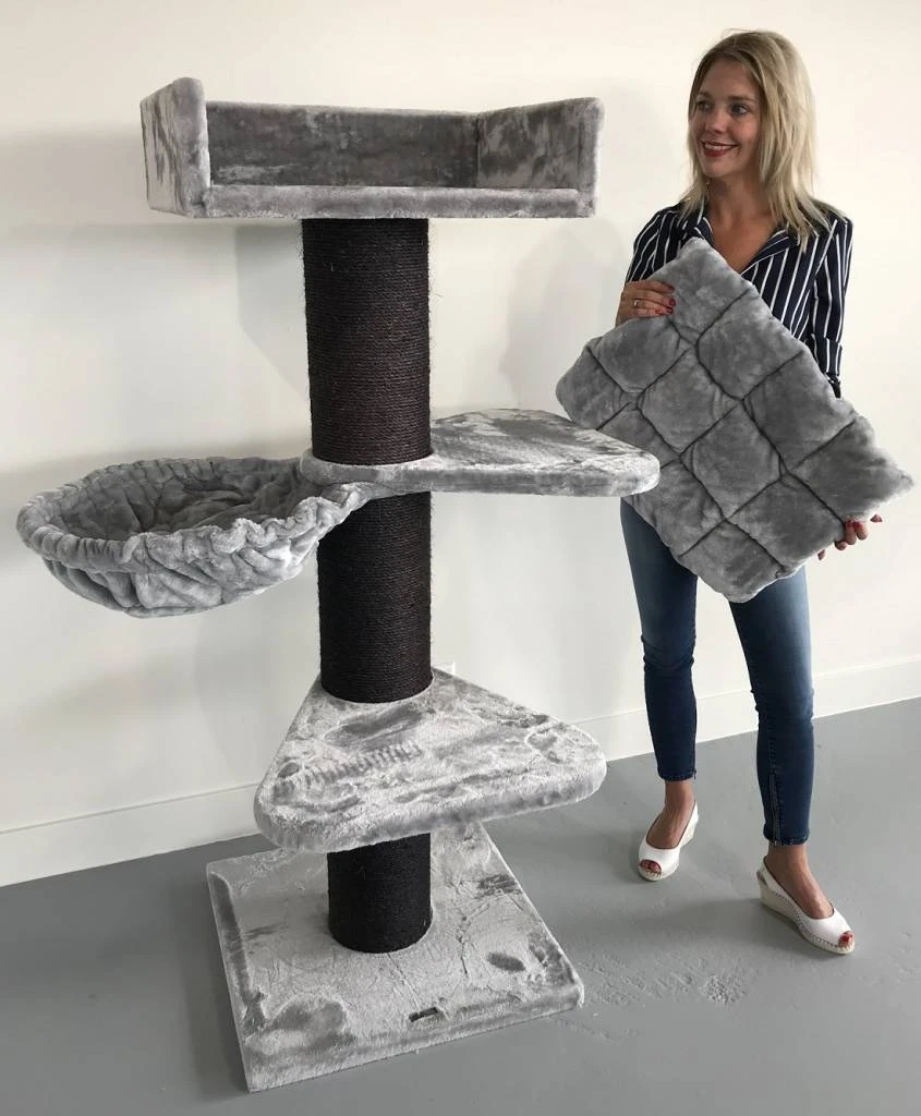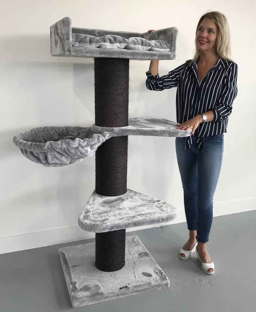 Krabpaal Royalty Plus Blackline Light Grey is zeer stevig met zijn 20cm diameter dikke sisalpalen en verzwaarde bodemplaat van 60Ă60 en 4,5cm dik. Krabpaal Royalty is een  krabpaal voor zware katten als Ragdoll of Maine coon of voor de klant die echt een stevige krabpaal wenst. De krabpaal Royalty heeft 2 grote (55Ă55) draaibare plateauâs en daarboven een enorme directiezetel van 62Ă42 cm met een 15cm hoge opstaande rand. Hierop ligt een 5 cm dik en heerlijk zacht kussen, welke uitneembaar is. Door zijn hoogte van 155 cm een ideale krabpaal voor in uw woonkamer en een ideale uitkijk en relaxplek voor uw kat.