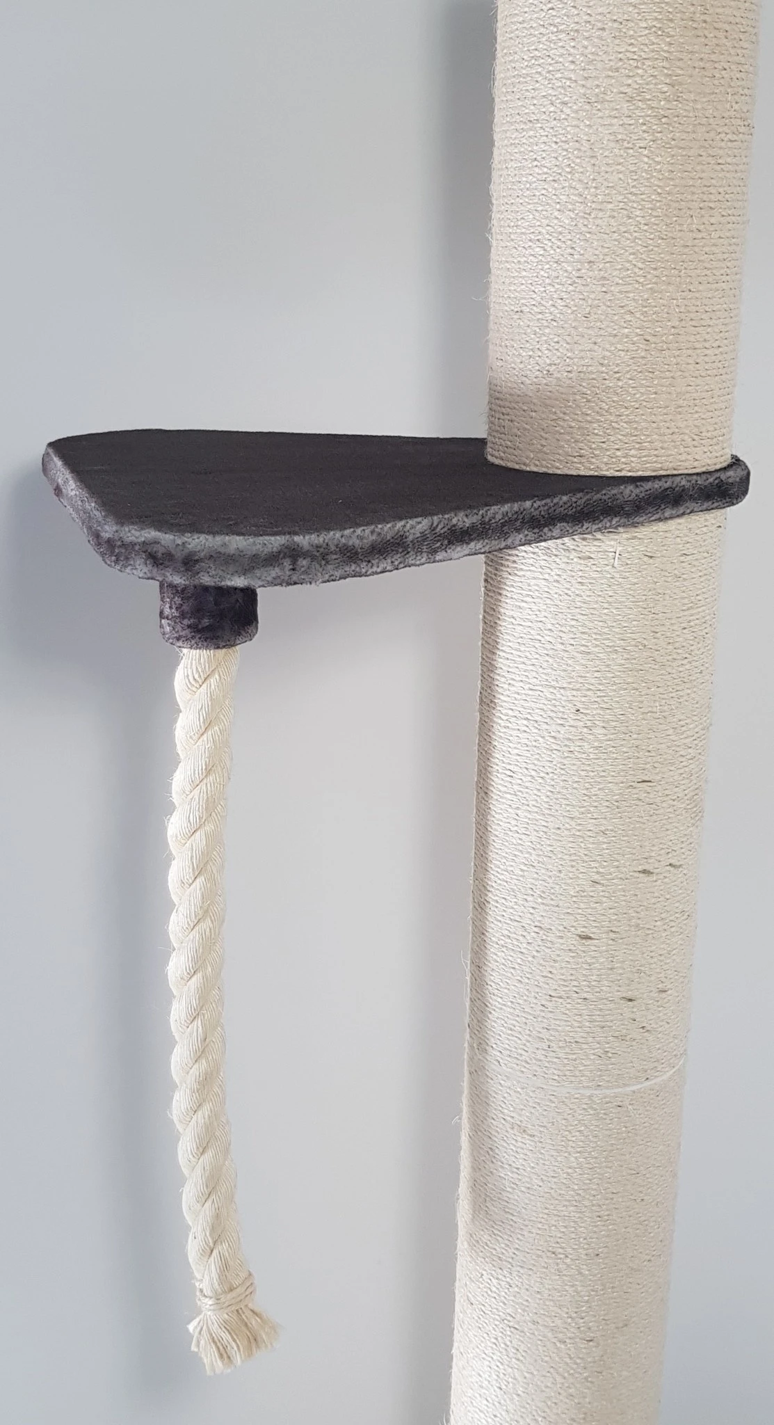 Driehoekige ligplaats met speeltouw. Makkelijk te plaatsen tussen de twee sisalpalen en een geweldige aanvulling op uw nieuwe of huidige krabpaal.
